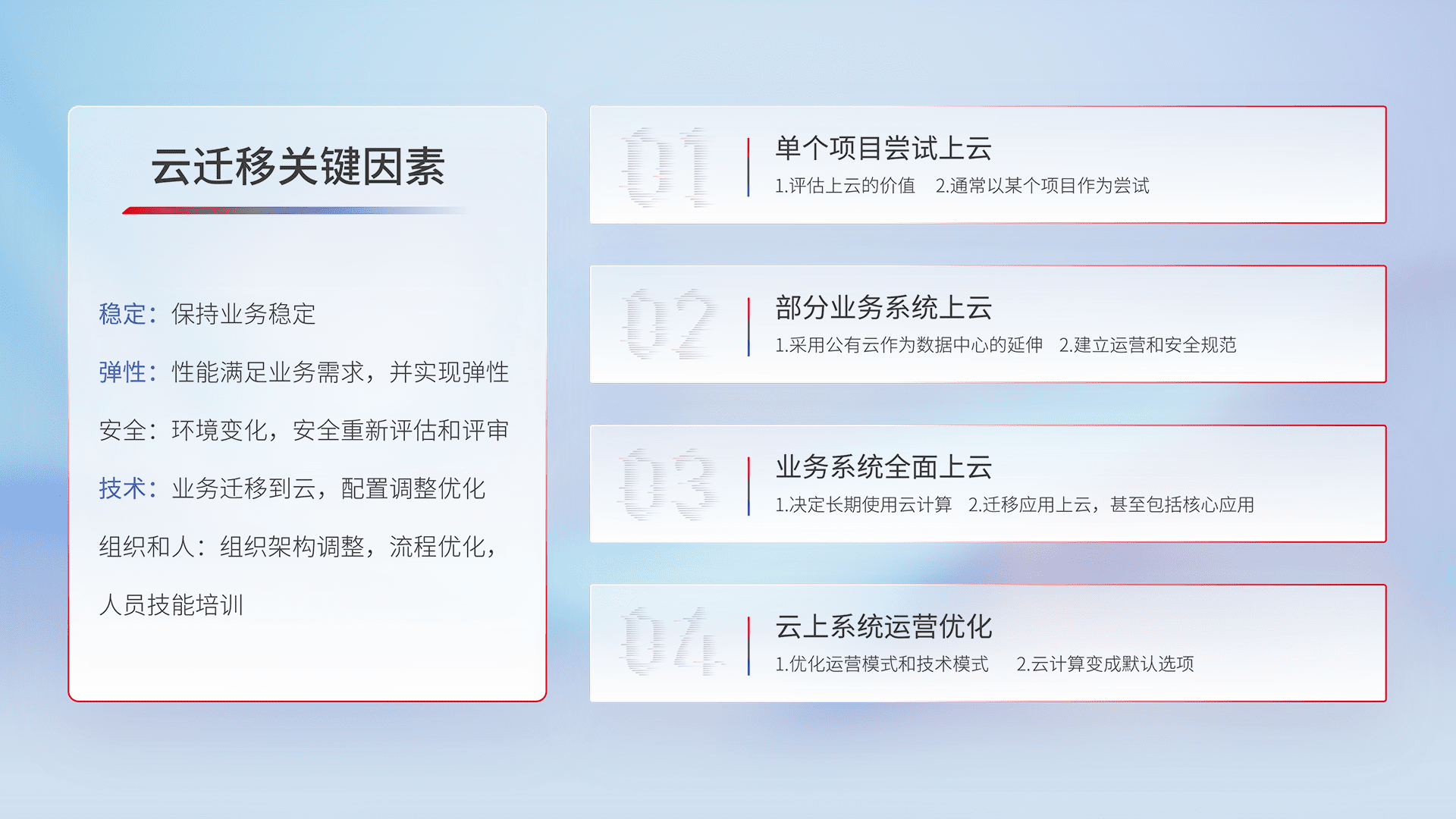 结合实际业务,,,从规划设计、、、、云平台选型、、、、云原生改造、、数据迁移、、集成交付,,,迁移全过程为客户识别最佳上云路径,,,做好风险识别管理,,,,设计网络架构、、、身份权限、、安全审计合规、、操作审计、、、日志审计、、、监控告警策略、、多站点容灾设计等,,,对云上基础设施进行整体规划,,,,提升IT治理水平,,以满足弹性、、高可用、、、高性能的需求。。。。