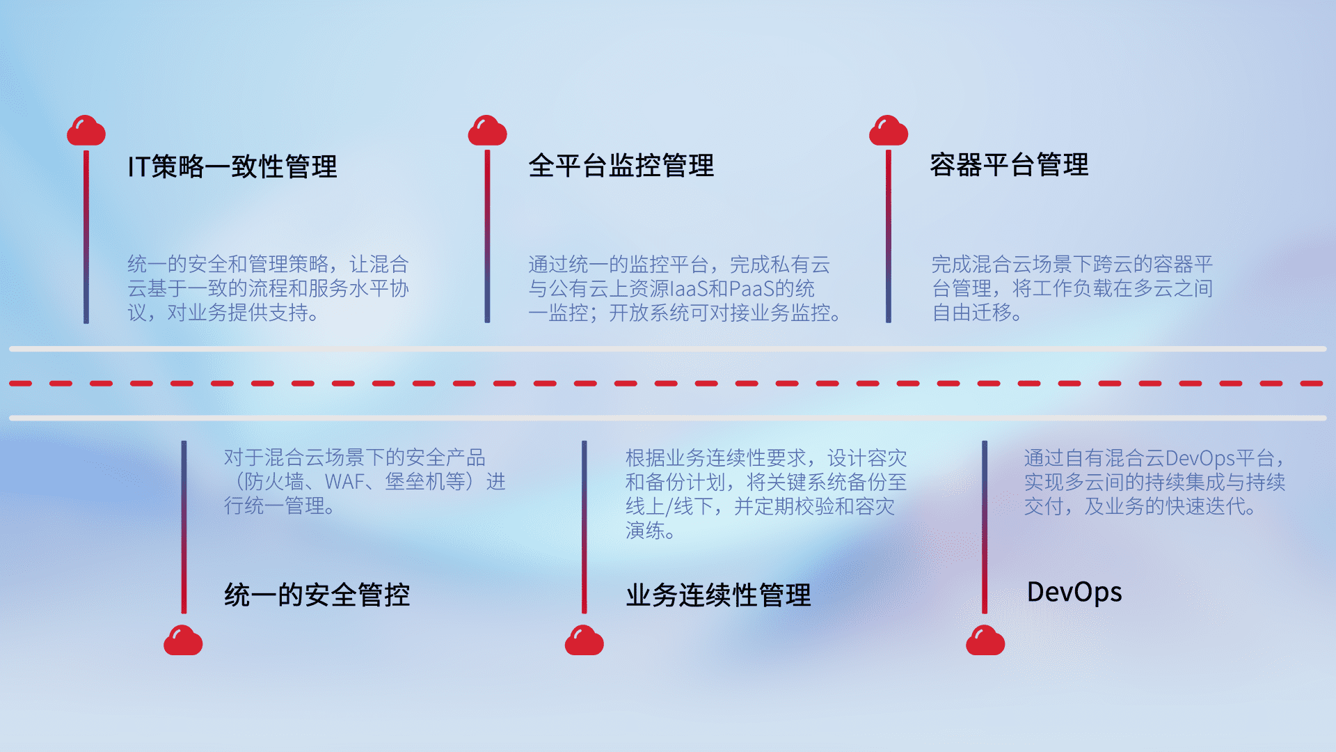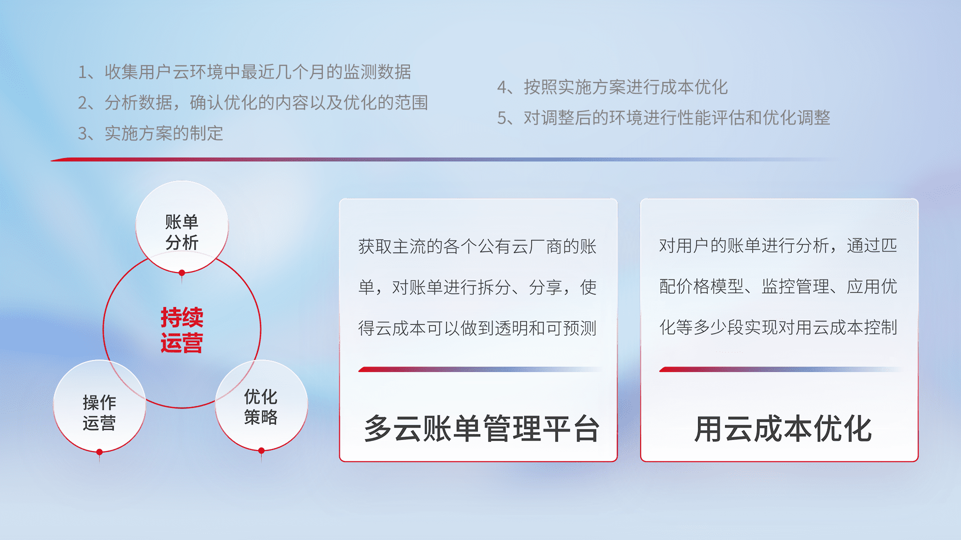 通过多云纳管,,,,以统一的资源数据模型把客户的云资源进行抽象和封装,,,进而实现对多云资源的统一操作,,,,保障云资源管理的可靠性、、、、稳定性与可用性。。量身定制化运维内容,,配置、、开发运维、、补丁管理、、、备份、、监控、、认证和访问管理、、审计和日常巡检等,,,,保障在用云过程中的可靠度,,,稳定度以及高可用率。。。。