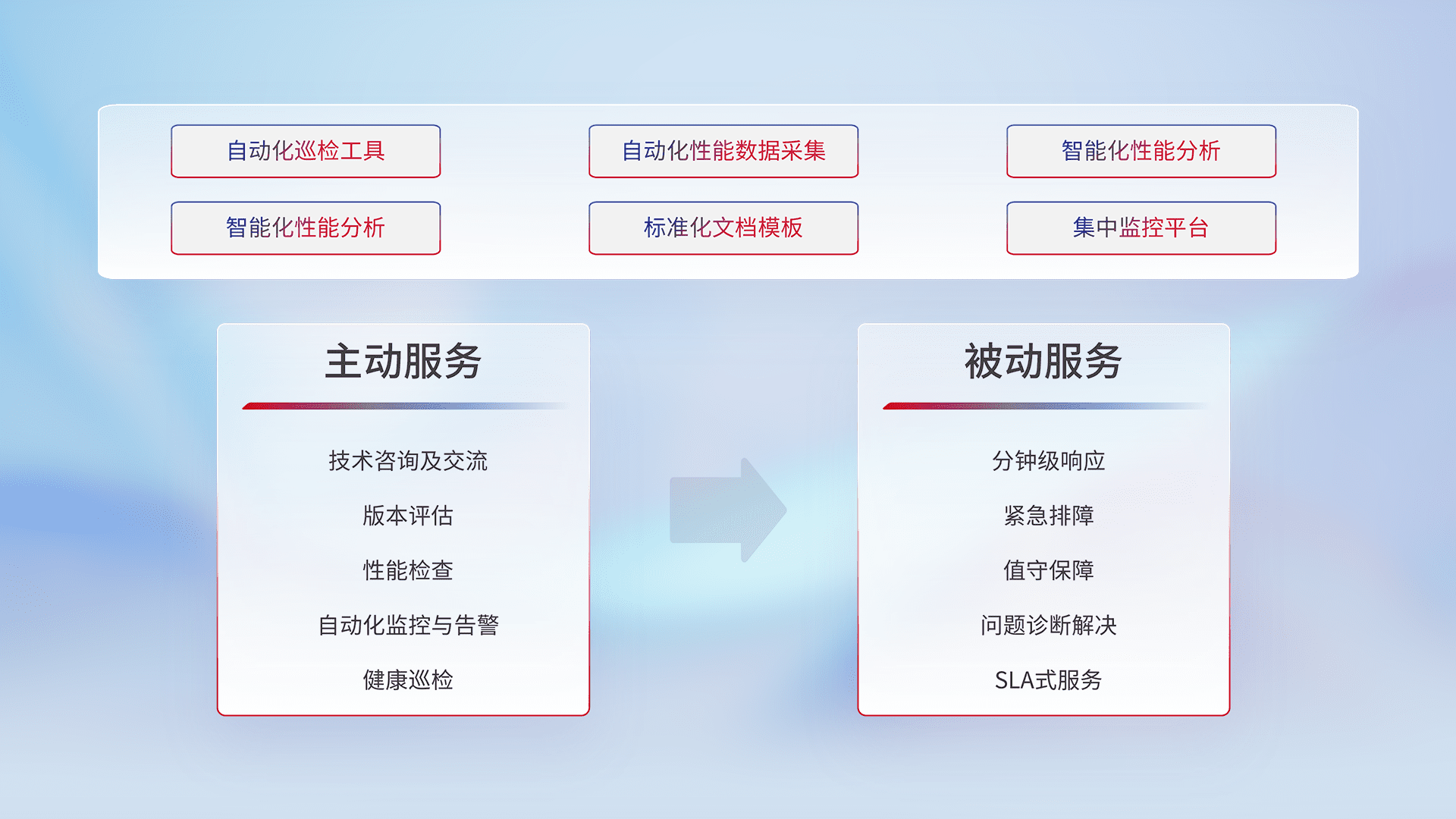 智能化工具和标准化文档,,,,保障服务质量,,,提供主动服务(包含技术咨询、、版本评估、、、性能检查、、、自动化监控与告警、、健康巡检)和被动服务包含(分钟级响应、、、紧急排障、、、、值守保障、、、问题诊断解决、、SLA服务)。。。